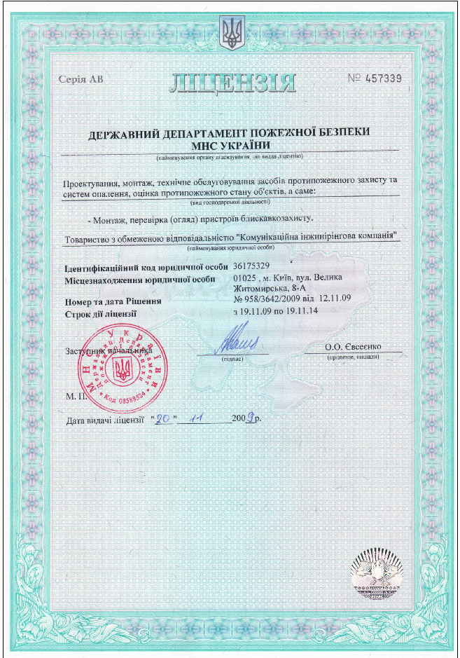 Лицензия на проектирование, монтаж, техническое обслуживание средств противопожарной защиты и систем отопления, оценка противопожарного состояния объектов.